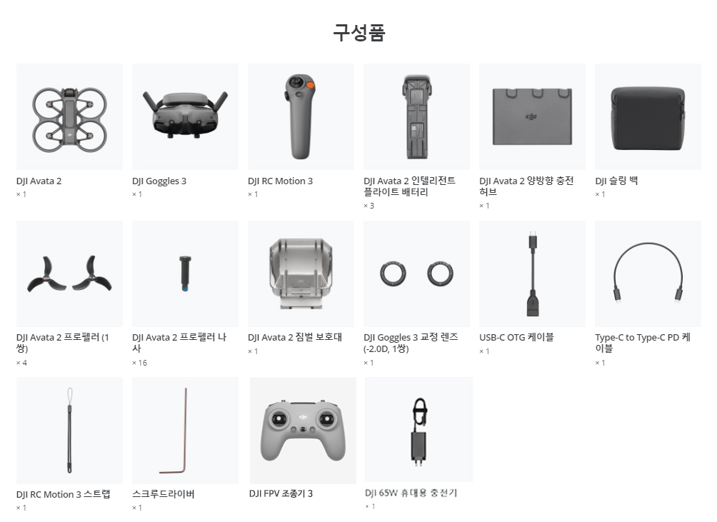 더 긴 비행 시간과 정밀한 촬영을 위한 DJI 아바타 2 플라이 모어 콤보+FPV 조종기 3+65W충전기 구성입니다.